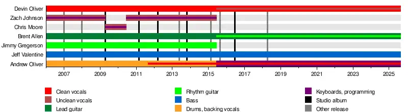 Their first album, 3-D (2009), peaked at No. 176 on the Billboard 200. Their second album, The End of the World Party, was released in 2011. The band's third studio album, Digital Renegade, was released in 2012 and demonstrated a stylistic change, featuring a more aggressive musical style than their prior albums.[2] The band also appeared on the song "Beauty and the Beast" by Dubstep producer BARE. The band's fourth studio album, New Demons, was released in 2013. It featured elements of EDM while achieving an even further aggressive style than Digital Renegade. In 2015, the band released a remix album, titled Phases. The band's lineup remained unchanged (excluding the brief departure of vocalist Zach Johnson in 2009, who returned the following year) from their formation in 2006 up until mid-2015, when the group announced the departure of Johnson and rhythm guitarist Jimmy Gregerson. Devin Oliver now pursues both clean vocals and unclean vocals. Their fifth studio album and the first album featuring the new line-up, Treehouse, was released in 2016. They released an EP, Treehouse (Acoustic), in 2018.