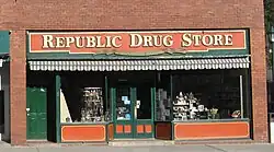 The Republic store was the target of arson[6] on September 4, 1917. While performing rounds the city marshal observed through the front windows an explosion occurred at the back of the shop. The resulting fire quickly grew to envelop seven buildings along the block.[7][8] While all seven buildings were lost, only the stock of the drug store was also lost, with $7,000 (equivalent to about $171,800 in 2024) to $8,000 (equivalent to about $196,300 in 2024) of merchandise burned. The fire was finally extinguished with help from the one working fire pump the city had.[7] After the Republic fires of 1917 Slagle moved the store location to its current spot and rebuilt in a two-story brick building which was completed soon after the fire in 1917–1918.[6][3]
