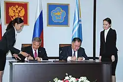 Tuva was a signatory to the 31 March 1992 treaty that created the Russian Federation. On 22 October 1993, a new constitution was drawn up for the republic, creating a 32-member parliament (Supreme Khural) and a Grand Khural, which deals with local legislation.[30] The constitution was approved by 53.9% (62.2% according to another source) of Tuvans in a referendum on 12 December 1993.[31] At the same time, the official name was changed from Tuva (Тува) to Tyva (Тыва).[32]