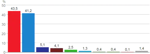 | Total | 43.5 | 163 | 41.2 | 157 | 4.1 | 3 | 2.4 | 9 | 1.8 | 5 | 1.6 | 7 | 0.9 | 2 | 0.6 | 3 | 0.4 | 1 |