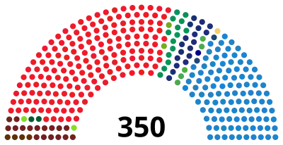 348 members of the Congress of Deputies were elected using the D'Hondt method and a closed list proportional representation, with an electoral threshold of three percent of valid votes—which included blank ballots—being applied in each constituency. Seats were allocated to constituencies, corresponding to the provinces of Spain, with each being allocated an initial minimum of two seats and the remaining 248 being distributed in proportion to their populations. Ceuta and Melilla were allocated the two remaining seats, which were elected using plurality voting.[2][3] The use of the electoral method resulted in an effective threshold based on the district magnitude and the distribution of votes among candidacies.[4]
