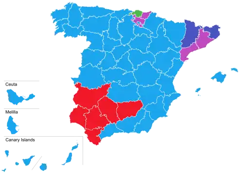 348 members of the Congress of Deputies were elected using the D'Hondt method and a closed list proportional representation, with an electoral threshold of three percent of valid votes—which included blank ballots—being applied in each constituency. Seats were allocated to constituencies, corresponding to the provinces of Spain, with each being allocated an initial minimum of two seats and the remaining 248 being distributed in proportion to their populations. Ceuta and Melilla were allocated the two remaining seats, which were elected using plurality voting.[2][3] The use of the electoral method resulted in an effective threshold based on the district magnitude and the distribution of votes among candidacies.[4]