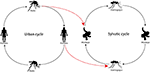 Yellow fever viruses, Dengue fever viruses, and Zika viruses are of the Flavivirus genera and Chikungunya virus is of the Alphavirus genera. All of them are considered arboviruses denoting their ability to be transmitted through arthropod vectors.[11][12] Sylvatic transmission cycles for arboviruses within non-human primate communities have the potential to spillover into an urban cycle within humans where humans could be dead-end hosts in scenarios where further intermingling is eliminated but much more probable is a reemergence of these viruses into either cycle due to spillback.[13] Apparently the maintenance of an arboviral urban cycle between humans requires a rare or understudied conjunction of factors to occur. One of the following situations occurs: