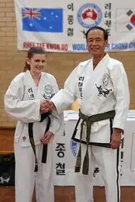 j. ^ Ex-members who founded ITF schools also include: Misko (Michael) Kordanovski, 8th dan;[98][99][100][101][102] Graham Moulden, 8th dan;[103][104][105][106][107][108][109] Spiridon Cariotis, 7th dan;[110][111][112] Steve Weston, 6th dan;[31][113] Scott Bower, 6th dan;[114] George Gabrielides, 5th dan;[115] Catherine McMaster;[116][117] Steven Luxmoore, 5th dan;[118][119] Trevor Harbrow, 2nd dan;[120][121][122][123][124] Shane Astwood, 3rd dan;[125] and Robert Clarkson, 4th dan,[126] Kordanovski was a Rhee Taekwon-Do 4th dan instructor under C. H. Rhee in Melbourne and was promoted to ITF 7th dan (ITF Master Instructor status) in 2007. His nephew Dragi Kuzmanovski trained in Rhee Taekwon-Do from 1975 to 1995 and was also a Rhee Taekwon-Do instructor.[98] Moulden commenced Rhee Taekwon-Do training in Queensland in 1976, was promoted to Rhee Taekwon-Do 1st dan in 1979, was a Rhee Taekwon-Do 3rd dan regional instructor in 1993, and was promoted to ITF 7th dan in 2012. Cariotis trained in Rhee Taekwon-Do around the early 1980s. Weston commenced Rhee Taekwon-Do training in Tasmania in 1983, was promoted to Rhee Taekwon-Do 1st dan in 1986, and was a Rhee Taekwon-Do instructor in 1993. Bower commenced training in Rhee in 1984, was promoted to Rhee Taekwon-Do 1st dan in 1988 and was a Rhee Taekwon-Do instructor in Townsville until 1999. Gabrielides was a Rhee Taekwon-Do instructor in Sydney from the 1980s until 1999. McMaster commenced training in Rhee Taekwon-Do in Adelaide, was promoted to Rhee Taekwon-Do 1st dan, was a Rhee Taekwon-Do instructor in Adelaide, and now teaches in her own school in Canberra. Luxmoore trained in Rhee Taekwon-Do in Queensland from 1986 to 1991, and was promoted to Rhee Taekwon-Do 1st dan. Harbrow was a Rhee Taekwon-Do 2nd dan instructor in New Zealand in 2003. Astwood commenced Rhee Taekwon-Do training in Queensland in 1992, and was a Rhee Taekwon-Do 1st dan instructor in 2003. Clarkson was a Rhee Taekwon-Do 1st dan member.