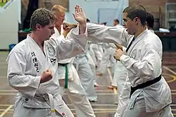 - The defender actively avoids or blocks an incoming attack executed by the training partner.[72] The defender has primary responsibility for non-contact, at a given moment during sparring, and this typically occurs with training partners of similar experience. This is normally the practice when both training partners are in the senior ranks.