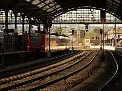 On 1 March 2008, the AVV published the Zukunftskonzept 2015 (future concept 2015), which envisaged the Rhein-Niers-Bahn (RB 33) being operated from both Duisburg and Mönchengladbach and Heinsberg to Aachen via Lindern. Thus, the Rhein-Niers-Bahn would take over operations on the Heinsberg–Lindern railway, with services to be operated by Euregiobahn under contract.[2] The final plans ultimately provided for portion working, in which two units of class 425 sets running from Aachen in double traction would be uncoupled.[3] This concept was finally implemented at the timetable change on 15 December 2013.