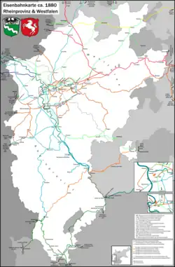 The Rhenish Railway Company’s lines in the Ruhr were not well connected to economic centres due to the relatively late construction, especially since they had been planned primarily for the transport of coal. This explains why most of these lines are no longer in operation. By contrast, its lines in the Rhineland and the Rhine Valley are still vital for rail transport.