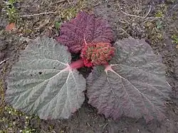 Rheum[2] is a genus of about 60 herbaceous perennial plants in the family Polygonaceae. Species are native to eastern Europe, southern and eastern temperate Asia, with a few reaching into northern tropical Asia. Rheum species are cultivated in Europe, Asia, and North America.[1] The genus includes the vegetable[3] rhubarb. The species have large somewhat triangular shaped leaves with long, fleshy petioles. The flowers are small, greenish-white to rose-red, and grouped in large compound leafy inflorescences. Many rhubarb cultivars have been domesticated as medicinal plants and for human consumption. While the leaves are slightly toxic, the stalks are used in pies and other foods for their tart flavour.