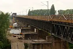 The superstructure of the flood bridge on the eastern bank, which was still largely in its original form as built in 1900, was replaced by a new superstructure with a ballast trackbed from 2009 to 2012. It consists of a two-track composite construction with two parallel beams connected by diagonal steel girders and a deck made of a concrete slab.