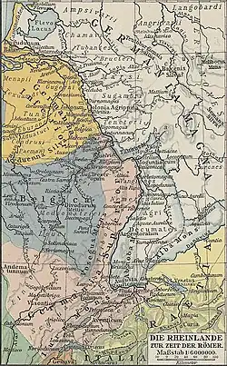 Historically, the term "Rhinelands"[1] refers to a loosely defined region encompassing the land on the banks of the Rhine, which were settled by Ripuarian and Salian Franks and became part of Frankish Austrasia. In the High Middle Ages, numerous Imperial States along the river emerged from the former stem duchy of Lotharingia, without developing any common political or cultural identity.