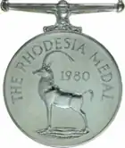 - The reverse depicts a sable antelope surrounded by the inscription 'THE RHODESIA MEDAL' and '1980'.