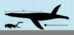 Rhomaleosaurus (meaning "strong lizard") is an extinct genus of Early Jurassic (Toarcian age, about 183 to 175.6 million years ago) rhomaleosaurid pliosauroid known from Northamptonshire and from Yorkshire of the United Kingdom. It was first named by Harry Seeley in 1874 and the type species is Rhomaleosaurus cramptoni. It was one of the earliest large marine reptile predators which hunted in the seas of Mesozoic era, measuring about 7 metres (23 ft) long.[1][2] Like other pliosaurs, Rhomaleosaurus fed on ichthyosaurs, ammonites and other plesiosaurs.