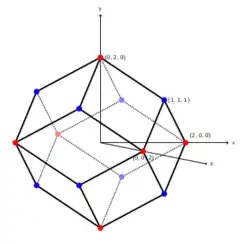 . With D3d symmetry, it can be seen as an elongated trigonal trapezohedron. It can be seen as the Voronoi tessellation of the face-centered cubic lattice. It is the Brillouin zone of body-centered cubic (bcc) crystals. Some minerals such as garnet form a rhombic dodecahedral crystal habit. As Johannes Kepler noted in his 1611 book on snowflakes (Strena seu de Nive Sexangula), honey bees use the geometry of rhombic dodecahedra to form honeycombs from a tessellation of cells each of which is a hexagonal prism capped with half a rhombic dodecahedron. The rhombic dodecahedron also appears in the unit cells of diamond and diamondoids. In these cases, four vertices (alternate threefold ones) are absent, but the chemical bonds lie on the remaining edges.[10]