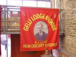 At the start of the First World War, the economic prospects in South Wales were good. Although production fell after the 1913 high, demand was still strong enough to push the coalfields to their limit.[60] In February 1917 coal mining came under government control and demand increased as the war intensified, ensuring a market for sufficient supplies.[60] After the war the picture began to change. Initially the British coal industry was buoyed by a series of fortuitous economic events, such as the American coal miners' strike, and by 1924 unemployment for miners was below the national average. But the belief that the mining industry would experience a permanent demand for coal was shattered by the Depression, when the Rhondda experienced a massive increase in unemployment.[61] The situation worsened in 1926, when in response to coalowners reducing pay and lengthening working hours of miners,[62] the TUC called a general strike in defence of the miners locked out following A. J. Cook's call "not a penny off the pay, not a minute on the day".[63] The TUC called off the strike just nine days later, without resolving the miners' cut in wages. The miners disagreed and stayed on strike for a further seven months until they were starved into surrender. The Rhondda saw many schemes set up by miners to aid their plight, such as soup kitchens and fêtes and "joy" days to support them,[64] while in Maerdy the local miners set up a rationing system.[63] By the time the miners returned to work, there was little desire for further action, which saw a decline in the popularity of 'The Fed'[63] and greater emphasis on solving problems by political and parliamentary means.[65]
