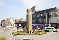 Rhyl has a number of Grade II listed buildings and landmarks. These include the Parish Church of St Thomas in Bath Street, which is listed as Grade II*.[6] Others are the Midland Bank building, the railway station along with two signal boxes and the public telephone box on the up platform, the Royal Alexandra Hospital, the Sussex Street Baptist Church, Rhyl Town Hall, the Swan public house in Russell Road, the war memorial, and the Welsh Presbyterian Church in Clwyd Street.[7]