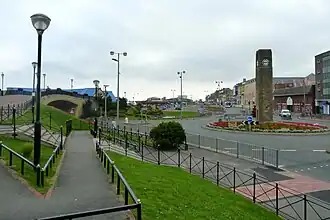 The Marine Lake Funfair was demolished in the late 1960s, having been replaced by the nearby Ocean Beach Funfair. Ocean Beach finally closed on 2 September 2007 and was demolished to make way for a planned new development initially called Ocean Plaza. This was to include apartments, a hotel and various retail outlets.[18] However, work on Ocean Plaza never went ahead as scheduled and the land lay vacant for several years after the original developers, Modus Properties, went bankrupt in 2009. The site was sold to a new company, Scarborough Development Group (SDG), in 2010, but again no work commenced on the site for several years. In 2014, SDG submitted revised plans to develop the land on a much smaller scale than the original plans.[19] Now called Marina Quay, the plans no longer include the building of new apartments on the land as Natural Resources Wales' flood regulations now prohibit this.[20] The plans were approved by the local authority in November 2014. In August 2015, The Range retail chain signed a 20-year lease and opened a new outlet on the site in March 2018.[21] Aldi also opened a branch on the site in 2019.