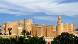 Founded in 796 by the Abbasid leader and the governor of Ifriqiya, Harthama ibn A'yan, several improvements and changes were introduced to the building throughout the medieval times, including the expansion carried out by Abu al-Qasim ibn Tammam in 966.[1] Initially it was quadrilateral shaped and then renovated into a composition of four buildings with two inner courtyards.[2] There's also a spiral stair of about a hundred steps leading to the watchtower where visual messages were exchanged at night with the towers of neighboring ribats.[2] Many watchtowers were added between 11th and 13th, 17th and 19th centuries in order to accommodate the artillery.[1] The towers are also climbable, allowing visitors to enjoy a view of the city and the beach.[2]