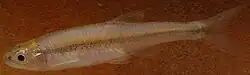 The ribbon shiner belongs to the family Cyprinidae. L. fumeus has a short snout that is rounded with a relatively large terminal mouth. The head is short with large eyes, and the diameter of the eye is greater than the length of the snout. The body is moderately deep, elongated, and laterally compressed. Its dorsal fin lacks the prominent black spot. This species has a dorsal fin that lacks the prominent black spot. The dorsal surface of the fish is typically an olive or straw color that has a silver overlay, and there is a dusky strip along its back. The ventral surface is a silvery white, and has a silver-black strip along its side. There are more than 21 predorsal scale rows, the scales are small, and there are 10–12 anal rays. The maximum length is 55 mm (2.16 inches).