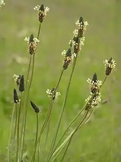 Plantago lanceolata is a species of flowering plant in the plantain family Plantaginaceae. It is known by the common names ribwort plantain,[1] narrowleaf plantain,[2] English plantain,[3] ribleaf, lamb's tongue, and buckhorn.[4] It is a common weed on cultivated or disturbed land.