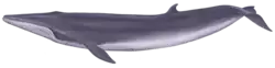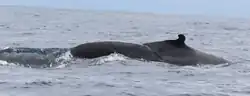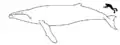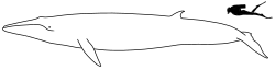 It is an intermediate-sized rorqual that is usually about the same size as the Eden's whale, although few adults have been reliably measured to date. The largest measured individual was a lactating female 12.65 meters (41.5 ft) in length; USNM 594665 is the largest known male of the species and is 11.26 meters (36.9 ft) long. Adults may be as small as 7 meters (23 ft) in length, and many verified and possible Rice's whales do not exceed 10 meters (33 ft). One beached calf was measured at 4.7 meters (15 ft) in length. In the wild, another calf has been observed to be around half the length of its supposed parent. One whale that washed up in Louisiana in 1982 was estimated at 15 meters (49 ft), but whether this is a Rice's whale remains unconfirmed as information on the diagnostic rostral ridges was never documented.[4] When using a length-weight function developed by Ohsumi (1980), a 12.65-meter (41.5 ft) length would correspond to a mass of around 13.87 metric tons (13.65 long tons; 15.29 short tons).[12][13] However, the NOAA reports a maximum weight of 27.2 metric tons (26.8 long tons; 30.0 short tons).[14]