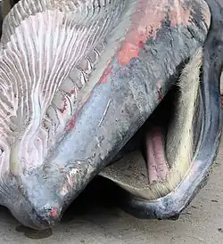 Forty-four to 54 ventral pleats run down the underside of the mouth, which are creases that allows the whale to expand the inside of its mouth when feeding. The pleats usually reach up to the navel, but some pleats extend beyond it. In the holotype specimen, one pleat extended 36 centimeters (14 in) beyond the navel and two additional elongated pleats were observed, although they could not be measured.[4]