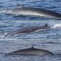 The dorsal side of the body is uniformly dark charcoal gray,[4] although this is sometimes reported as dark brown.[12] The belly and underside of the tail is pale to pinkish. This light coloring is especially prominent on the ventral side of the peduncle. There is neither asymmetric pigmentation on the lower jaws nor blaze or chevron pattering on the body, which distinguishes the Rice's whale from fin whales and Omura's whales. The flippers are uniformly dark-colored. In some phenotypic variations, a gradient of white also appears around the rim of the dorsal fin and/or along the side of the body, but there is no consistency of the trait between individual whales.[4]