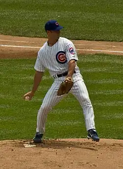 Harden was traded to the Chicago Cubs on July 8, 2008, in a six-player deal. The Cubs traded Matt Murton, Eric Patterson, Sean Gallagher, and Josh Donaldson to Oakland for Harden and Chad Gaudin.[6] He made his Cubs debut on July 12, against the San Francisco Giants, leaving the game with a 7–0 lead after pitching 5+1⁄3 scoreless inning and striking out 10. Though the Cubs won 8–7, Harden earned a no decision after Carlos Mármol was unable to hold a five-run lead in the ninth.[7] Harden registered ten strikeouts and allowed only one run in both of his following starts, but was not able to earn a win.[8][9] He finally recorded his first win as a Cub on July 31, 2008, against the Milwaukee Brewers.[10] At this point, Harden had the highest winning percentage among all starting pitchers over the last three years, with a record of 15–4 (.789).[11] On October 8, 2008, the Cubs picked up the $7 million option in Harden's contract for the 2009 season.[12] He had a 9–9 record in 2009.[13] He became a free agent following the season.