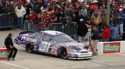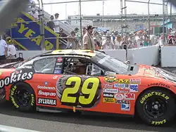 In just his third Winston Cup start, Harvick beat Jeff Gordon by mere inches (.006 seconds) to win the Cracker Barrel 500 at Atlanta Motor Speedway, dedicating the win to Earnhardt.[9] After posting another win at Chicagoland Speedway and finishing in the top-ten in points (Despite missing a race), Harvick won NASCAR Winston Cup Rookie of the Year honors. In 2002, his infamous temper escalated after announcing on his radio he would intentionally wreck another driver during a Craftsman Truck Series race. Having been put on probation at the time for actions in an earlier-season race, in response, NASCAR benched Harvick for the next race, and Harvick was replaced during that time by Kenny Wallace. Since then, Harvick has won eight races, including the prestigious Brickyard 400 and Daytona 500 while scoring a (at the time) career-best points effort of 4th in both 2006 and 2008. Despite a win early in the 2005 season, 14th-place efforts in 2004 and 2005 proved to be frustrating, as Harvick threatened to leave the team if performance did not improve. A series of strong runs near the end of 2005 seemed to satisfy him, however, and he was back in the car in 2006 with Reese's as a new co-primary sponsor. After a somewhat slow start, Harvick hit his stride in April, with a string of Top 10 finishes, including a win at Phoenix. This helped RCR to be a dominant force in NASCAR again. After weeks of speculation as to where Kevin would drive starting in 2007, he and RCR announced a new three-year deal that he would drive for him until 2009. For 2007, the team had a significant change in sponsorship. GM Goodwrench would move to an associate sponsor role on the No. 29, while Shell Oil Company and Pennzoil took over the primary sponsorships. Harvick's 2007 season started out on a high note with a win in the Daytona 500 in a close finish with veteran Mark Martin. Harvick would score another win at the All-Star Race, holding off Jimmie Johnson. Harvick entered a slump during the summer, and was involved in a trackside altercation with Juan Pablo Montoya. However, Harvick and his team held off a struggling Dale Earnhardt Jr. to make the Chase for the Cup. Harvick's Chase performance would not be a repeat of 2006, and he would finish 10th in the points. Harvick improved in 2008, he did not win but did score 19 top tens, tying a career-best 4th in the final points standings as a repeat of 2006. Harvick won the 2009 Budweiser Shootout and finished second in the Daytona 500.