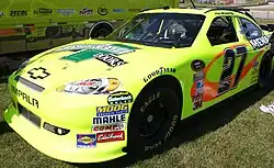 Green posted six Top 10s in the 2002 season, including a career best second at Loudon in July,[72] and finished seventeenth in points.[73] Although the team started 2003 with a Daytona 500 pole,[73] Green and the team failed to jell as Childress had hoped and on May 5, was fired following the first race at Richmond. In what amounted to a trade between organizations, Green was replaced by the former driver of the No. 1 car for Dale Earnhardt, Inc., Steve Park, with Green taking Park's ride at DEI.[74][75][76][77] Green's firing was largely connected to an altercation between him and teammate Kevin Harvick during the Richmond race in which Harvick wrecked Green while racing for a top 10 position, igniting an already tumultuous relationship between the two drivers that went back to their competition in the Busch Series.[73][74][75] Park would score a pole at Daytona in July[78] and earn two Top 10s but had only six finishes inside the Top 20, ending the season 32nd in points.