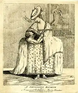 The Cosways' marriage is thought to be an arranged marriage of convenience, and not only due to his being 20 years her senior.[5][7] Richard Cosway was an effeminate Macaroni with "a mincing, affected air" dressed in the height of fashion: "His small plain person was to be seen in all the public places clothed in a mulberry silk coated embroidered with scarlet strawberries, with a sword and bag and small three-cornered hat perched on the top of his powdered toupée."[8] It was also said he was "well known as a libertine and commonly described as resembling a monkey."[9]