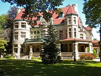 The Richard F. Newcomb House is a historic house located at 1601 Maine Street in Quincy, Illinois. The house was built in 1890-91 for Richard F. Newcomb, the founder of the Quincy Paper Company; the company eventually became a national strawboard-producing firm. Local architects Harvey Chatten and Ernest M. Wood collaborated on the house's Richardsonian Romanesque design; the style choice was inspired by the recently built William S. Warfield House, which Newcomb admired and wished to outdo. The three-story house has a massive limestone exterior with a red shingled roof. The house's wraparound front porch is supported by limestone pillars; smaller porches are located throughout the design. A large conical tower and a smaller octagonal tower rise from the southwest and southeast corners of the house respectively.[2]