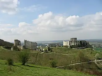 Richard began his reconquest of the lost lands in Normandy. The fall of the Château de Gisors to the French in 1193 opened a gap in the Norman defences. The search began for a fresh site for a new castle to defend the duchy of Normandy and act as a base from which Richard could launch his campaign to take back Vexin from French control.[117] A naturally defensible position was identified, perched high above the River Seine, an important transport route, in the manor of Andeli. Under the terms of the Treaty of Louviers (December 1195) between Richard and Philip II, neither king was allowed to fortify the site; despite this, Richard intended to build the vast Château Gaillard.[118] Richard tried to obtain the manor through negotiation. Walter de Coutances, Archbishop of Rouen, was reluctant to sell the manor, as it was one of the diocese's most profitable, and other lands belonging to the diocese had recently been damaged by war.[118] When Philip besieged Aumale in Normandy, Richard grew tired of waiting and seized the manor,[118][119] although the act was opposed by the Catholic Church.[120] The archbishop issued an interdict against performing church services in the duchy of Normandy; Roger of Howden detailed "unburied bodies of the dead lying in the streets and square of the cities of Normandy". The interdict was still in force when work began on the castle, but Pope Celestine III repealed it in April 1197 after Richard made gifts of land to the archbishop and the diocese of Rouen, including two manors and the prosperous port of Dieppe.[121][122]