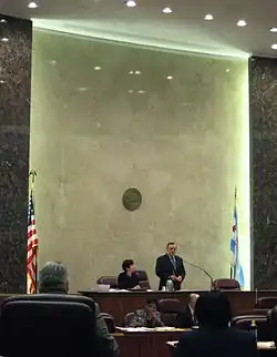 After Edward Nihill stepped down, Daley, with the support of the Democratic political organization, was elected to the Illinois Senate, serving from 1972 to 1980.[22] State Senator Daley rarely spoke to reporters and didn't hold a news conference for six years.[12] Daley chaired the Senate Judiciary Committee. Daley was named one of Illinois' ten worst state legislators by Chicago Magazine "for arrogance, for sharklike qualities, for living off his father's name, and for pulling puppet strings attached to some of the worst members of the Senate." He was considered "too shrewd to be one of the worst, but he controls so many of the worst senators that he belongs on the list to represent all of them."[10][23] After the Spring 1975 state legislative session, Chicago Democrat Dawn Clark Netsch, who served with Daley as Illinois Constitutional Convention delegates and as State Senators, blamed "dirty little Richie" for frustrating her good government legislative agenda in the state legislature.[24][25]