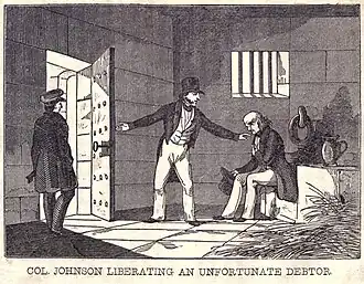 Johnson was admitted to the Kentucky bar in 1802,[13] and opened his law office at Great Crossing.[14] Later, he owned a retail store as a merchant and pursued a number of business ventures with his brothers.[15] Johnson often worked pro bono for poor people, prosecuting their cases when they had merit.[16] He also opened his home to disabled veterans, widows, and orphans.[15] Johnson also became a prominent Freemason, and in the late 1830s was part of a Masonic organization, the Hunters Lodge, that unsuccessfully planned an invasion of Canada to overthrow the British government there and establish a provisional American administration.[17]