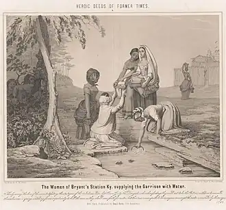 About the time of Richard's birth, the family moved to Bryan's Station, near present-day Lexington in the Bluegrass Region. This was a fortified outpost, as there was much Native American resistance to white settlement.[7] The Shawnee and Cherokee hunted in this area. Jemima Johnson was remembered as among the community's heroic women because of what was told of her actions during Simon Girty's raid on Bryan's Station in August 1782.[8] According to later reports, with Indian warriors hidden in the nearby woods and the community short on water, she led the women to a nearby spring, and the attackers allowed them to return to the fort with the water. Having the water helped the settlers beat off an attack made with flaming arrows. At the time, Robert Johnson was serving in the legislature in Richmond, Virginia, as he had been elected to represent Fayette County.[9] (Kentucky was part of Virginia until 1792.)
