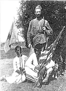 The overhead telegraph may have been intended as a link in the proposed line from the Cape to Cairo, it was to be supported by 7m-high poles at 150m spacings and had been allocated a budget of three million francs.[63][64] Mohun was allowed free rein to choose his own staff and set out with five electricians/engineers (including some from Britain and France), Dr. Raan Horace Castellote as medical officer and a military escort commanded by Belgian Captain Verhellen.[61][64][65][66] He advertised among the Askari of Zanzibar for volunteers to provide the escort required by the expedition, and received more than one thousand responses.[66] From these, he selected one hundred men to accompany him, twenty of whom had served with him in the Congo expedition of 1894.[66] The work was hoped to have been completed by 1900.[64]