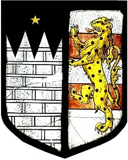 Arms of Reynell: Argent, masonry sable a chief indented of the second[1] | |
