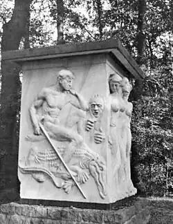The plinth of the monument resting on the staircase is the white marble cuboid designed by Max Klinger. It has an edge length of 2 metres (7 ft) and is 2.9 metres (10 ft) tall. Three of its side surfaces show figures from the work of Richard Wagner as reliefs in larger than life size. The three Rhinemaidens from the opera cycle Der Ring des Nibelungen are depicted as undressed women on the front. They are intended to symbolize music, poetry and drama at the same time and thus allude to Wagner's striving for the Gesamtkunstwerk.[3] On the left are Siegfried, Mime and the slain dragon to see, on the right the Grail keeper Parsifal and the Grail messenger Kundry.[4]