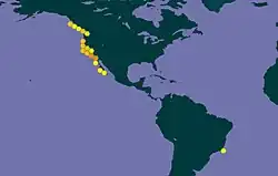 This species occurs in the Pacific Ocean off the western coasts of Canada, US and Mexico; also in the Atlantic Ocean off Brazil.