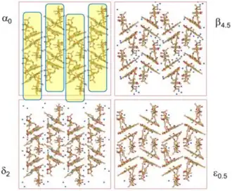 Rifaximin can exist in different crystalline forms depending on the degree of hydration. They drastically differ in water solubility, which has to be taken into account during the manufacturing process.[45][46] Wet rifaximin exists in the β-form, which can be dehydrated to obtain forms α and δ. ε-Form can be only obtained by dehydrating δ-form. Amongst them, γ-form is the most stable and is resistant to high humidity levels.[47]