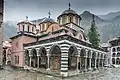 The main church of the monastery was erected in the middle of the 19th century. Its architect, Pavel Ioanov, worked on it from 1834 to 1837. The church has five domes, three altars and two side chapels, while one of the most precious items inside is the gold-plated iconostasis, noted for its wood-carving, the creation of which took five years by four handicraftsmen: Atanas Teladur, Petar and Georgi Dashini and Dimitar Stanishev. The participation of Petre Filipovich- Garkata is questionable.[3] The frescoes, finished in 1846, are the work of many masters from Bansko, Samokov and Razlog, including the famous brothers Zahari Zograf and Dimitar Zograf. The church is also home to many valuable icons, dating from the 14th to the 19th century. Porticos in the courtyard have Mamluk influence with the striped painting and the domes, which became more popular in the Ottoman Empire after the conquest of Egypt.