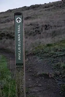 Phyllis Ellman, a biochemist, and member of the Marin chapter of the Native Plant Society, played a key role in the campaign to preserve Ring Mountain from development during the 1970s.[9] Known as “Mother Botany” for her expertise in local wildflowers, Ellman's efforts were instrumental in creating the preserve.[8] Today, a roughly two-mile-long trail was named in her honor.