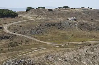 A number of rare and endangered plant species inhabit Ring Mountain.[4] The mountain's twin summits consist of serpentinite,[5] a rock which is very high in magnesium, producing soils of unusual chemistry (serpentine soil). The landscape is strewn with many sizable boulders which exhibit a variety of lithologies including high-pressure metamorphic rocks of amphibolite, blueschist, greenschist, and eclogite grade.[6]