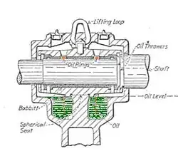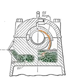 Ring oilers were used for speeds up to around 1,000 rpm.[1] Above this, the oil tended to be thrown centrifugally from the ring, rather than carried by it (although it is still currently applied on steam turbines with speeds around 3200 rpm). The bearing must also remain horizontal and stable, so although suitable for crankshaft main bearings, they could not be used on connecting rod big end bearings. They were not used on vehicles for similar reasons, although the engines concerned at this time were anyway too large and heavy for practical mobile use. Automatic ring oilers were particularly useful for large engines with multiple horizontally opposed cylinders, where it was otherwise difficult to access the central main bearings.[1] Ring oilers were most suited where bearing side-loads were relatively light, but the bearing capacity required more lubrication than could be supplied by a drip feed oiler. For this reason they were widely used on larger electric motors and generators.[2][3]