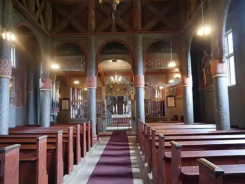 Around the year 1630, the master-builder Werner Olsen (ca. 1600–1682) began a large expansion and renovation project on the church.[8] The nave was enlarged by adding a transept wing to the north and south, creating a cruciform floor plan. A new central tower was constructed on the roof over the central part of the nave. This significant renovation changed the character of the church and it left several free standing posts in the interior of the nave that remained from the original stave church, but most of the rest of the building looked quite new at the time. The church was painted in 1717, but only the lower half of the walls were done, since the ceiling at that time was lower.[6][7]