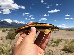 The Rio Grande sucker (Pantosteus plebeius) is a North American freshwater fish in the family Catostomidae. It has a typical bottom-feeding phenotype and fills lower trophic levels alongside Rio Grande cutthroat trout and Rio Grande chub species.[3] It is smaller sized in comparison to its other family members, with females being the larger between sexes. Coloration tends to benefit the species due to counter-shading patterns. It is endemic to the Rio Grande basin and was once common throughout. The species has maintained a population in New Mexico, Colorado, Arizona, and Northern Mexico, but has faced challenges from the pressure of non-native species, habitat loss, degradation, and a variety of other aquatic ecosystem changes.[4] There is current pressure from environmental organizations to federally list the species as threatened or endangered.[5]