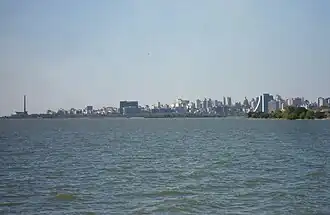 Guaíba (Portuguese pronunciation: [ɡwaˈibɐ]) is a major water body in Rio Grande do Sul, the southernmost state of Brazil. It is commonly referred to either as a "river" (Portuguese: Rio Guaíba) or as a "lake" (Lago Guaíba).[1][2] The Jacuí River, the Sinos River, the Gravataí River and the Caí River empty into Guaíba from the north, which in its turn empties into the Lagoa dos Patos, the largest lagoon in South America further down south. The body of water covers 496 square kilometres (192 sq mi) in total.