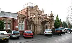 Communications were improved with the opening of Ripon railway station in May 1848.[27] During the First World War, a large military training camp was built in Ripon; the local community offered hospitality not only to soldiers' wives but to the Flemish refugees who became part of Ripon's community.[28] The racecourse south-east of the city also served as an airfield (RFC Ripon) for the Royal Flying Corps (and latterly, the Royal Air Force). The racecourse was also used as a demobilisation centre for troops returning from France well into 1919.[29][30]