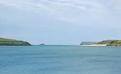 The mouth of the Camel lies between Stepper Point on the west and Pentire Point on the east, and each headland shelters sandy beaches. On the west side of the estuary, Tregirls beach is protected by Stepper Point. At the northern end of Tregirls beach is Harbour Cove and between here and Hawker's Cove evidence has been found of occupation during the Bronze Age, Iron Age and Roman periods, and use of Harbour Cove for trading vessels.[38]