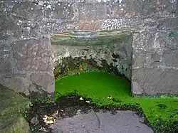 The Monk's or Mack's or Maaks Well at Kilmaurs,[23] pronounced 'Manks Well' runs into the Carmel beneath Kilmaurs Place. It is said that many years ago the local laird tried to prevent the local people from using the well. It dried up until the lord changed his mind, but has run continuously ever since. A few deaths have occurred here by drowning or by physical trauma[24] Next to the Kilmaurs-Glencairn church in Kilmaurs is a patch of woodland that was once an orchard. The Tour streamlet joins the Carmel nearby and before the confluence can be found an old well, arched over, known as the Lady's Well, with never-failing, excellent and refeshingly cool water. A small wooden bridge used to run across to the Lady's Well from the church glebe side.[2]